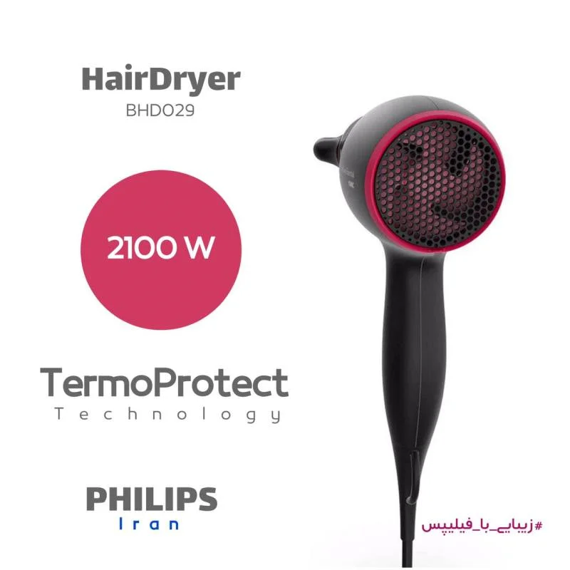 سشوار فیلیپس مدل BHD029 یکی از تولیدات جدید کمپانی فیلیپس بشمار می رود که با توان 2100 وات و موتور DC یک گزینه عالی برای مصارف خانگی بحساب می آید . موتورهای DC در مقایسه با موتورهای AC در سشوارها وزن سبکتر و صدای کمتری دارند . BHD029 دارای سه درجه تنظیم حرارت و دو درجه تنظیم سرعت می باشد . عملکرد باد سرد نیز برای این مدل درنظر گرفته شده که به حفظ حالت مو کمک می کند . تکنولوژی TermoProtect از دیگر ویژگی های بسیار خوب این سشوار زیبا بحساب می آید که از موها در برابر حرارت بالا محافظت می کند تا آسیبی به موهای شما وارد نشود . همچنین تکنولوژی محافظت یونی این دستگاه به درخشندگی موها و وز نشدن آنها بسیار کمک می کند . طول سیم دستگاه 1.8 متر بوده و دارای حلقه نگه دارنده و سری متمرکز کننده هوا نیز می باشد . BHD029 طراحی شده در کشور هلند و مونتاژ کشور چین می باشد .