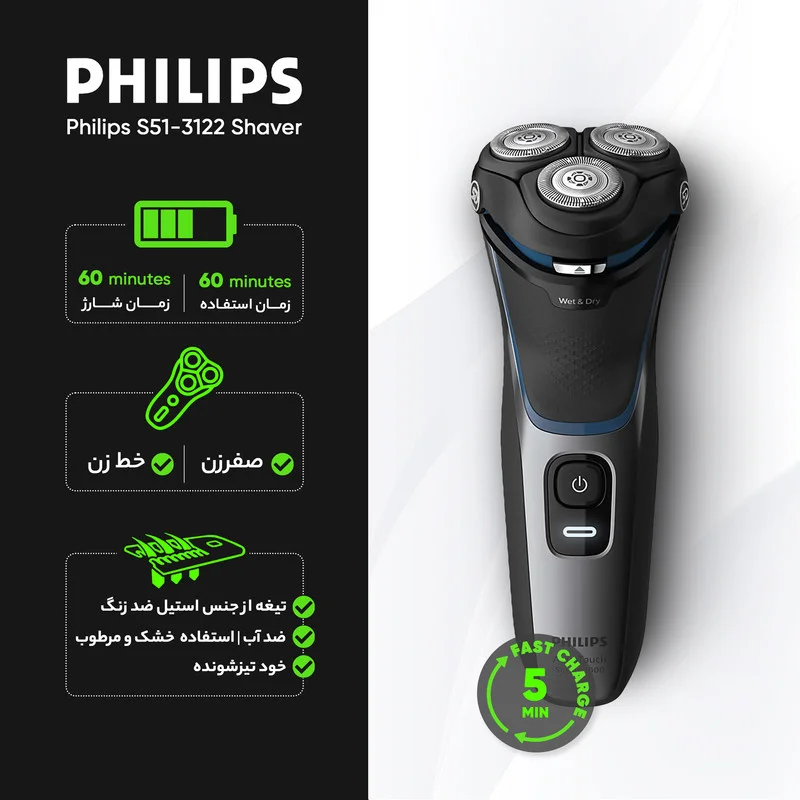 ماشین اصلاح فیلیپس مدل S3122-51، برای کسانی که به دنبال یک اصلاح تمیز و دقیق هستند، گزینهای عالی و قابل اعتماد است. تکنولوژی اصلاح در این ریشتراش به صورت چرخشی بوده که باعث میشود بتوانید خط ریشی دقیق داشته باشید و در کمترین زمان ممکن، موهای صورت خود را اصلاح کنید. چرخش سر این ریش تراش در ۵ جهت باعث میشود تا ریش تراش با انحنای صورت هماهنگ شود و اصلاح راحتتر صورت گیرد. به وسیله خط زن این دستگاه میتوانید سبیل و خط ریش خود را به صورت دقیق اصلاح کنید. این نکته را در نظر داشته باشید که در این مدل، خط زن در پشت دستگاه نصب شده است و به صورت فنری باز میشود.
